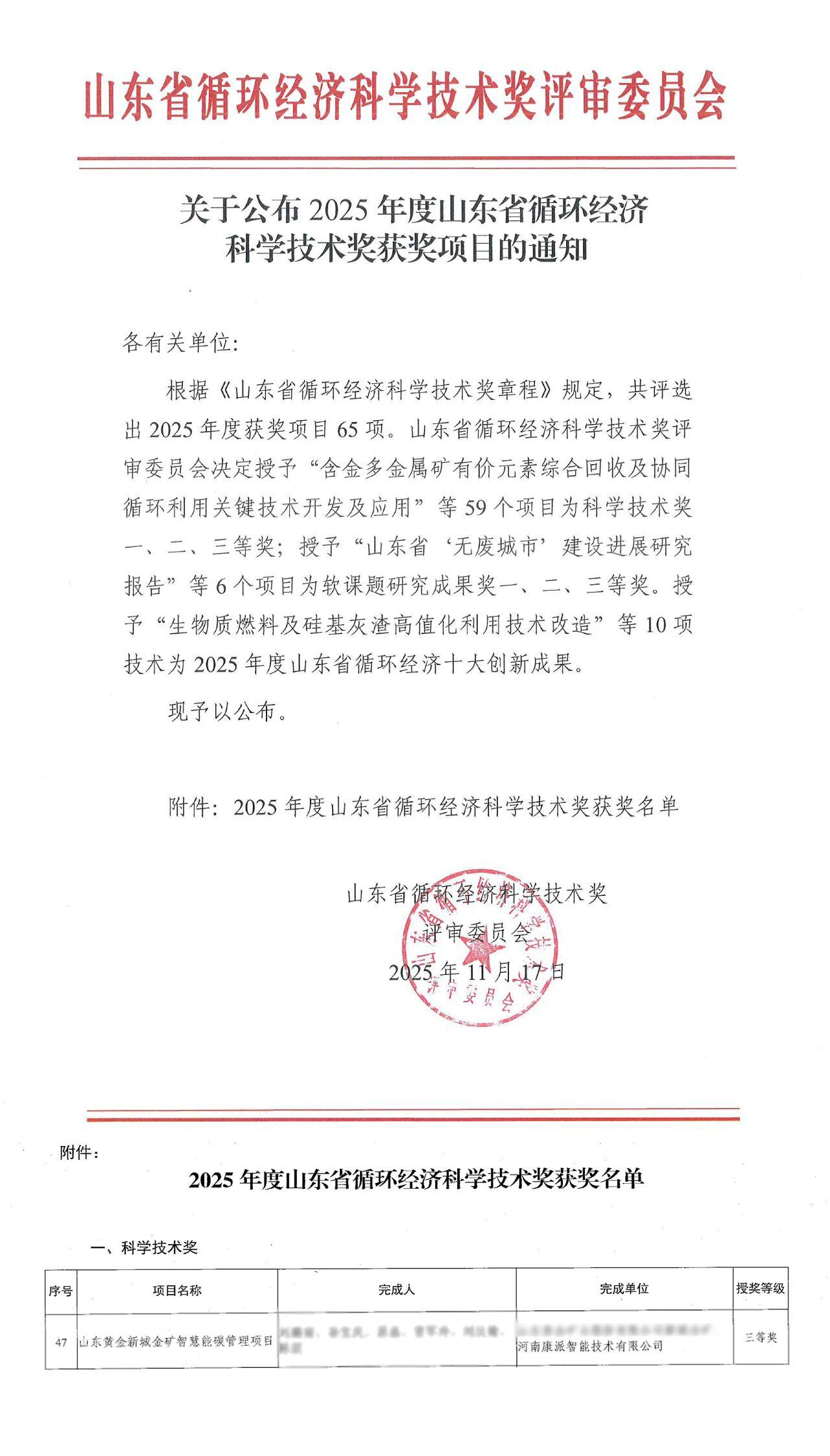 喜報丨康派智能榮獲2025年度山東循環(huán)經(jīng)濟(jì)科學(xué)技術(shù)獎